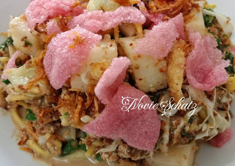 - Susun dalam piring saji lontong/ketupat, daun ubi, kol, kacang panjang, tahu, toge, timun, mie kuning basah..lalu siram dgn kuah lotek td..atasnya beri kerupuk merah dan bawang goreng..lotek siap di hidangkan😊.